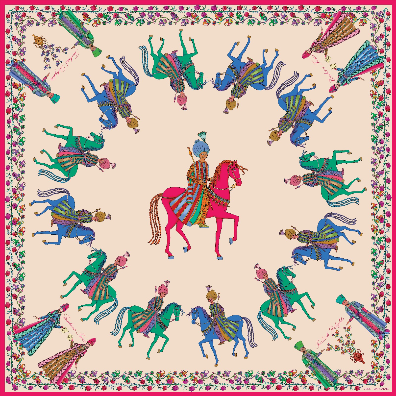 'Turkish Delights' Vero Marganne'nin yeni kreasyonu, Osmanlı giysilerinin zarif güzelliğinden ilham alıyor. Renklerinin armonisini, tatlılığını ve oyunbaz cazibesini yakalamak istedi. Bu eşarp, Osmanlı zarafetini romantik bir estetikle birleştiriyor, onun hayal gücünden doğan şiirsel bir sahne gibi.